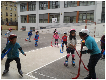 Los niños de la extraescolar de Patinaje se atrevieron el jueves pasado con el hockey sobre patines. Stick en mano y ampliando horizontes en el patio de Teobaldos, las manos se multiplicaban para poder llegar a la pelota.