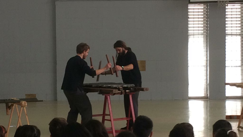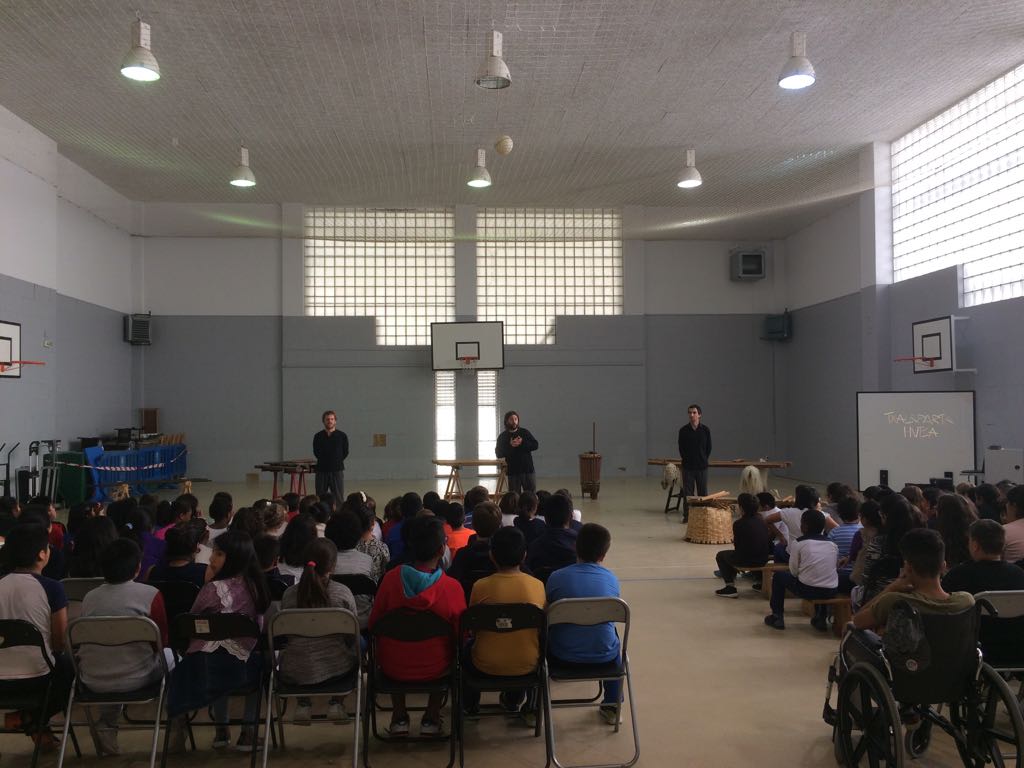 Solo hay que cerrar los ojos y dejarse llevar por el ritmo. Un diálogo entre golpes de madera o piedra, muy bien armonizados, distintos tonos, timbres y ritmos nos trasladan a la antigua tradición de la txalaparta de la mano de HUTSUN TXALAPARTA TALDEA. Una manera de comunicarse a través del sonido y por tanto, una forma de hacer música. Este jueves 26 de octubre, los alumnos de 3º a 6º hemos asistido en nuestro gimnasio a un peculiar concierto en el que hemos dejado por un momento los instrumentos “clásicos” para acercarnos a otra manera de hablar, a través de la historia de la TXALAPARTA. Mikel, Simón y Anai nos han explicado el origen de la txalaparta y su evolución hasta nuestros tiempos y hasta nos han dejado probar. Los nacidos en febrero y noviembre hemos sido los afortunados. Parece fácil pero después de un ratito…¡vaya paliza! ¡Hay que tener buenos brazos y mucha concentración!