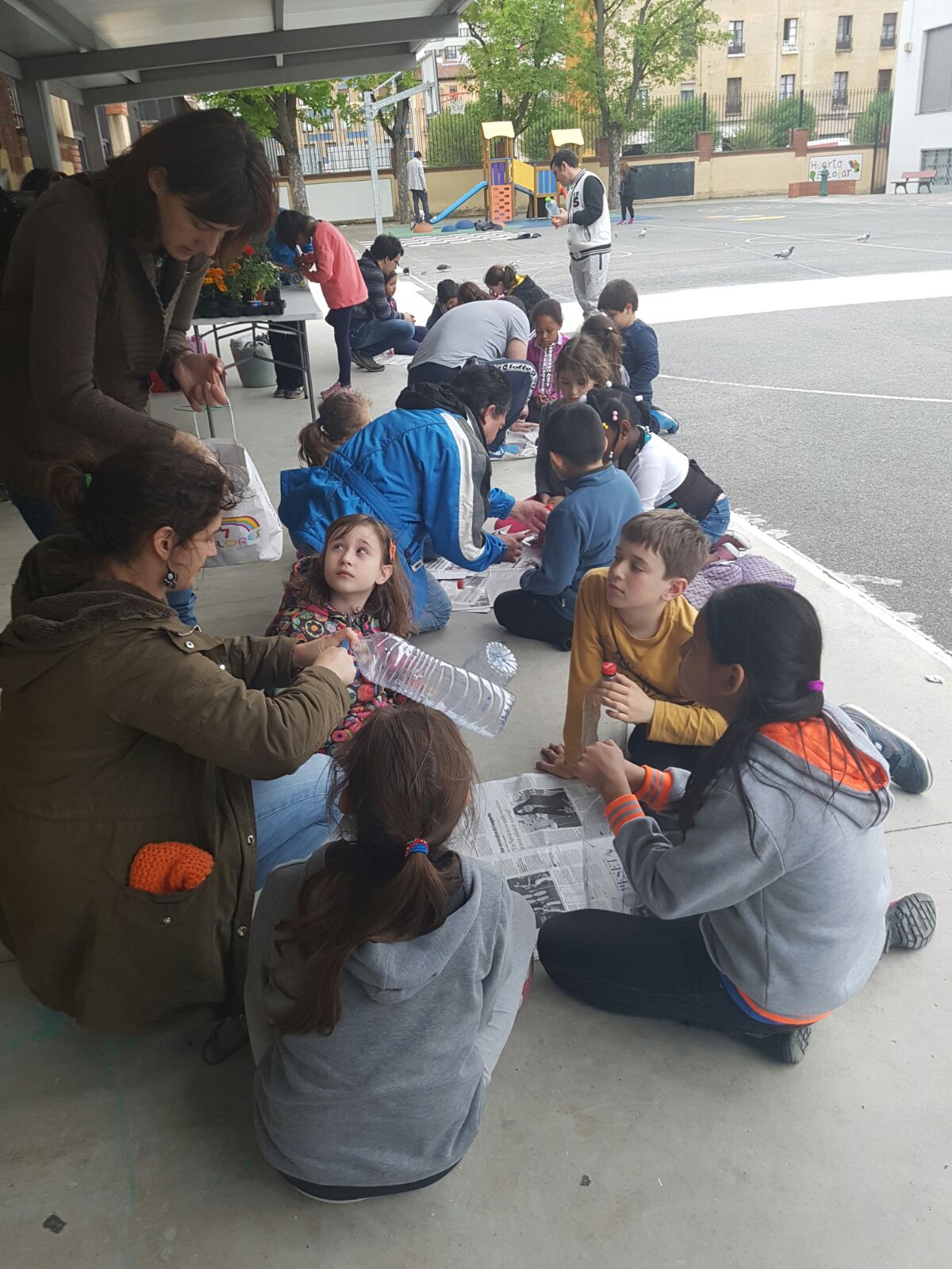 Como casi siempre que se organiza alguna actividad al aire libre en el cole, los nubarrones estuvieron amenazando, un poco cotillicas, a ver si se enteraban de qué iba esto del taller de jardinería. Y se quedaron tan pasmados con el resultado que no se atrevieron a echar ni una gota.