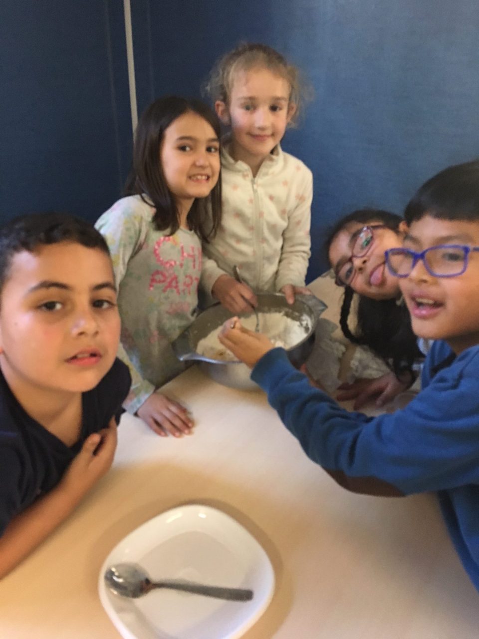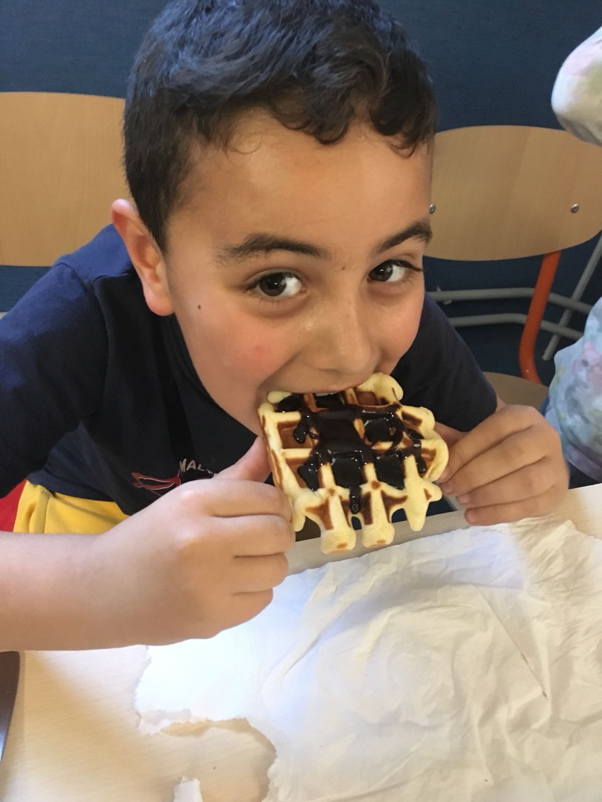 Con el taller de cocina de la tarde sabemos que tenemos éxito garantizado…pero hay que sobrevivir a él. Este año nos hemos atrevido a preparar gofres, el famoso postre belga. El comedor del cole se llena hasta los topes, hay que preparar la masa y un montón de niños esperan impacientes.