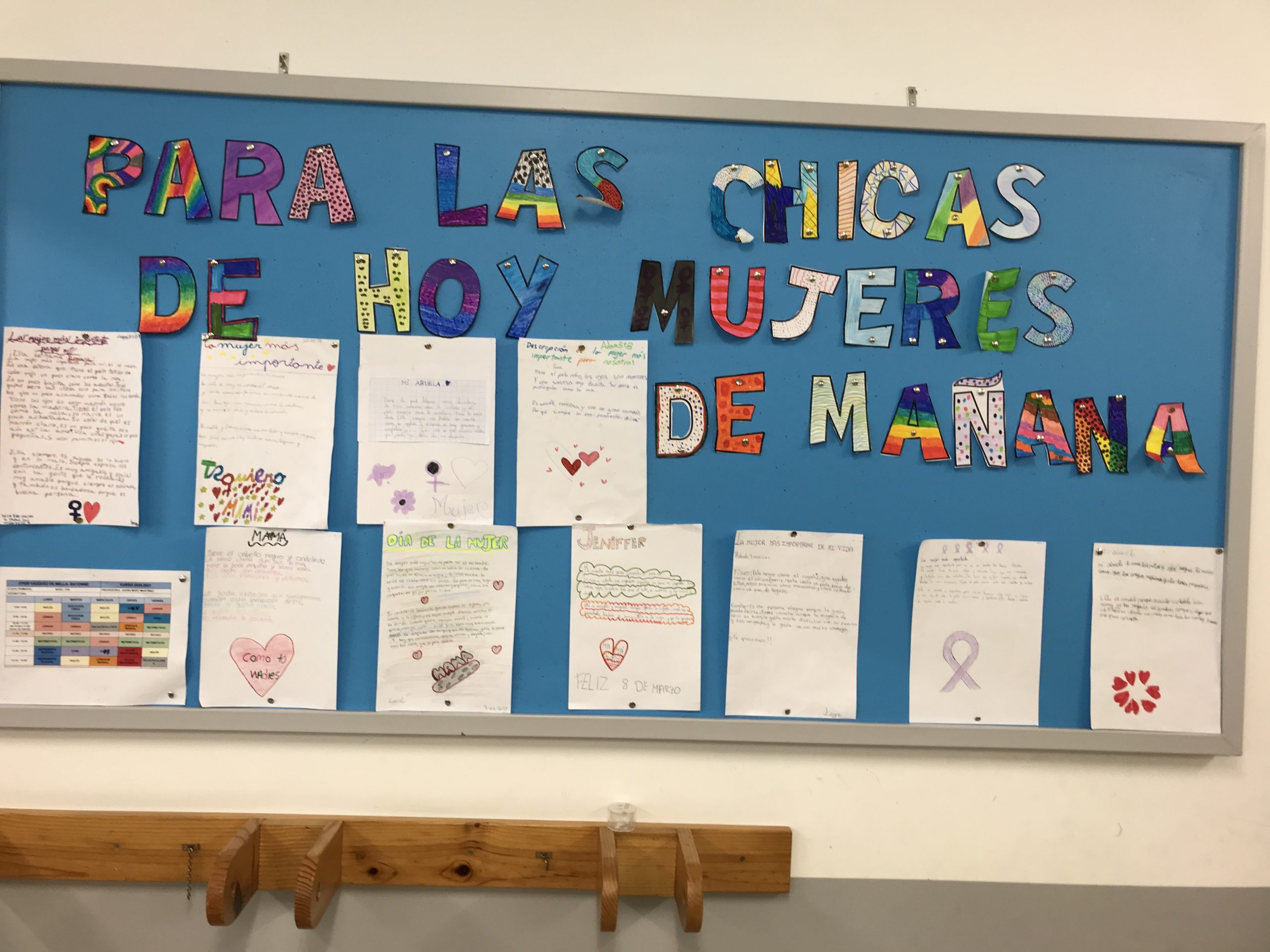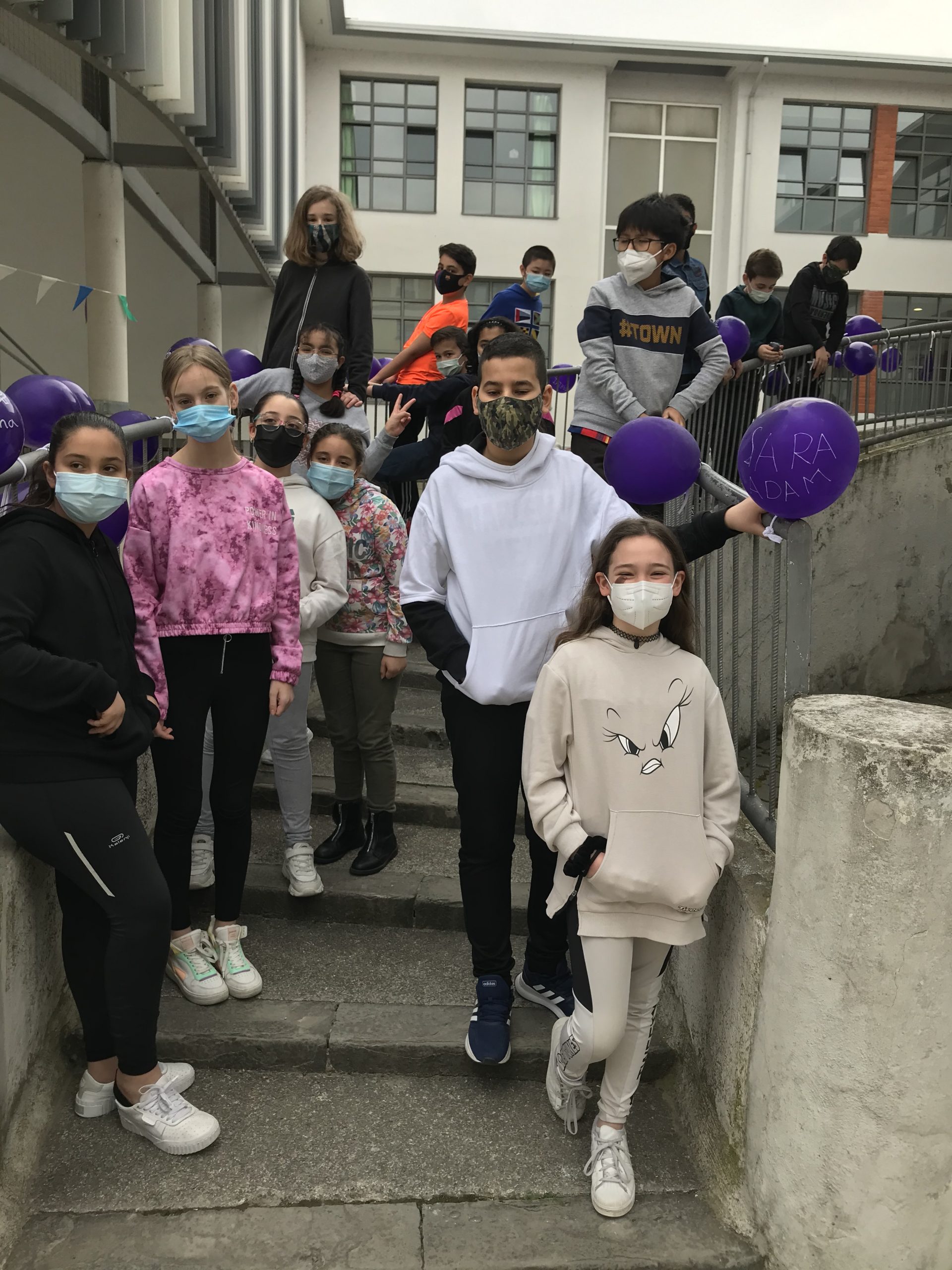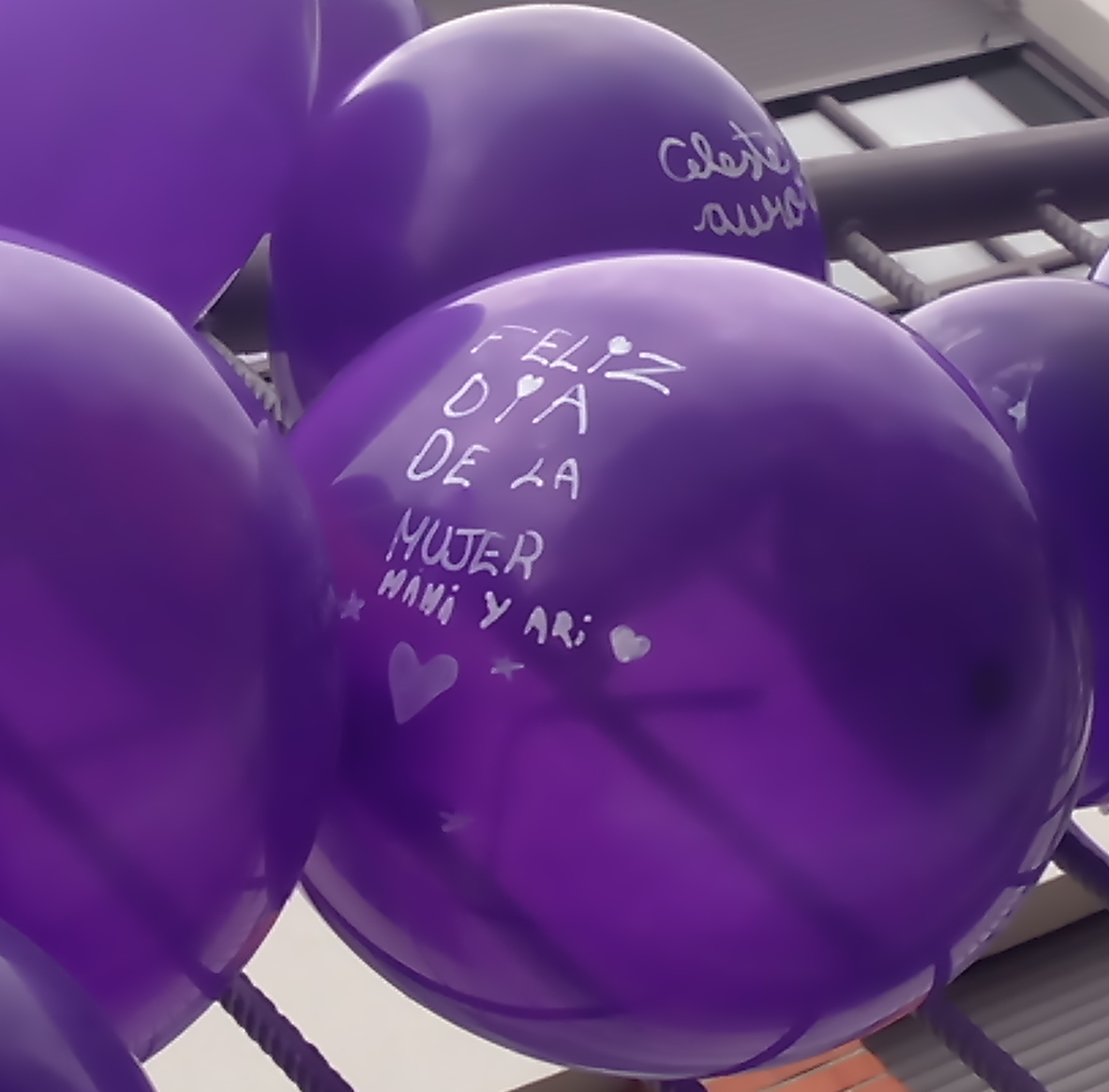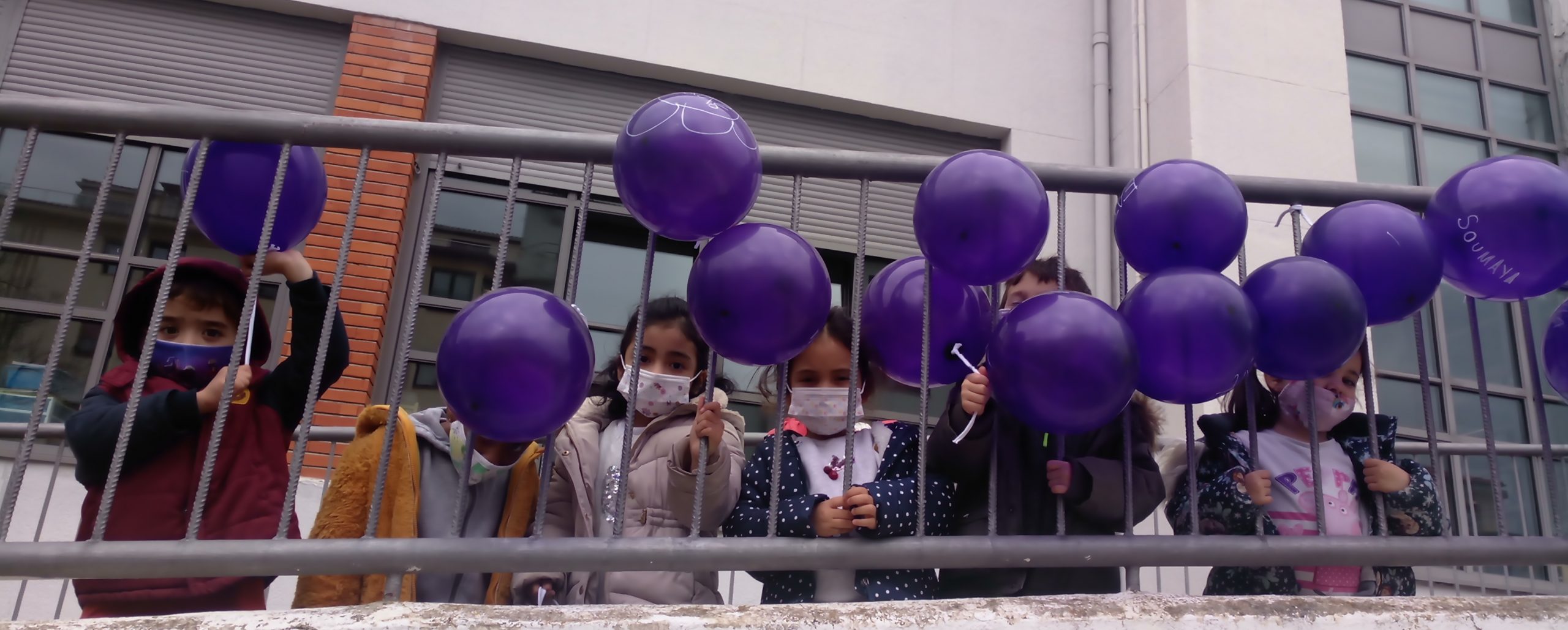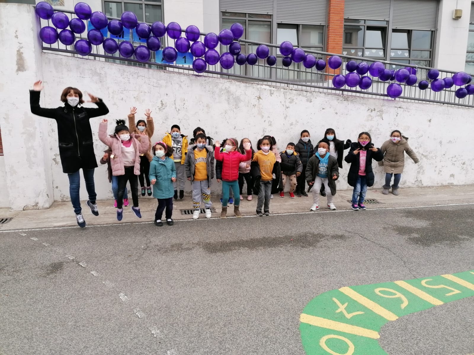 En todas las aulas se ha hablado de mujeres importantes en el mundo y también de las «mujeres importantes» para nuestro alumnado. Se han realizado actividades diversas y todos/as hemos salido a los patios a decorar el colegio con globos morados, uno por cada niño y niña con el nombre de su mujer importante.